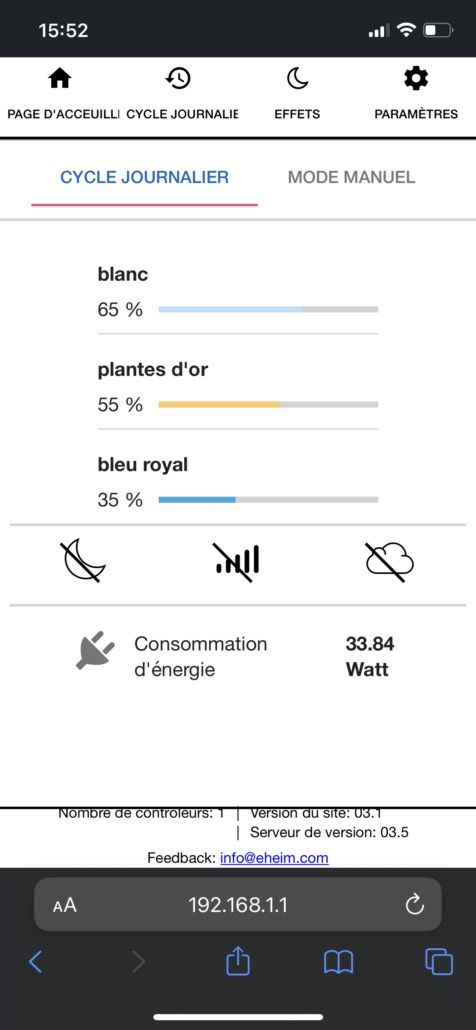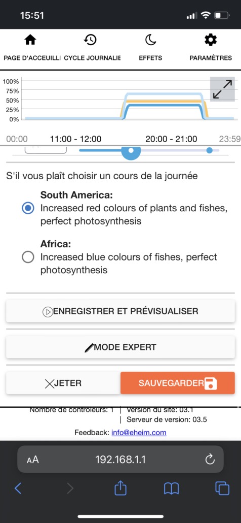 journalier » est bien sélectionné. Dans le cas contraire, le paramétrage précédant ne servirait à rien. Vous pourrez également explorer les différentes options comme le mode d’acclimatation, nocturne, ou encore jouer avec chacune des couleurs des rampes installées.